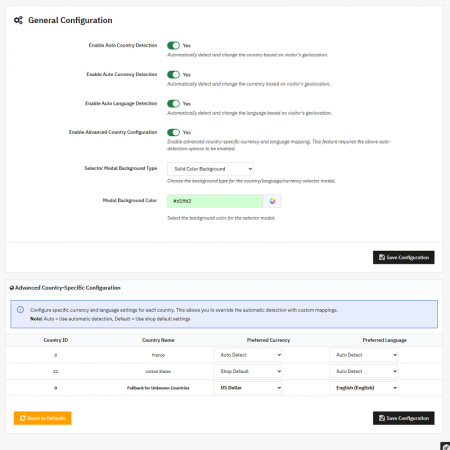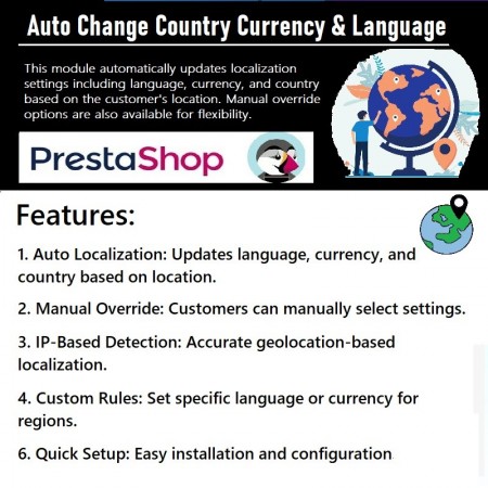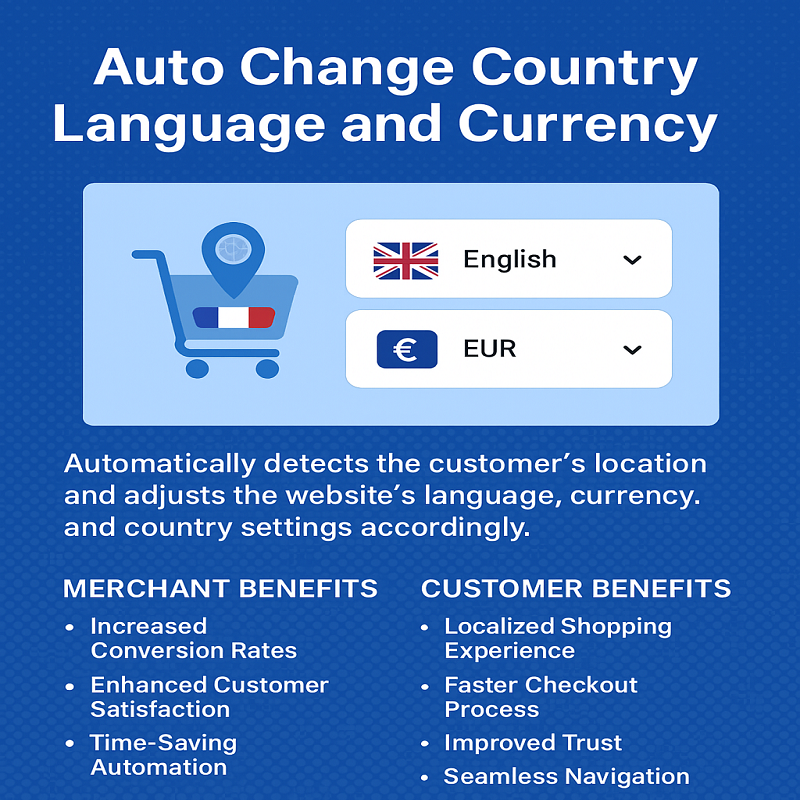 The Auto Change Country Language and Currency module automatically detects the customer’s location and adjusts the website’s language, currency, and country settings accordingly. By providing a personalized shopping experience based on the customer’s region, this module helps improve usability, customer satisfaction, and conversion rates. Perfect for multi-regional or international stores, it ensures that customers feel at home while browsing your store.