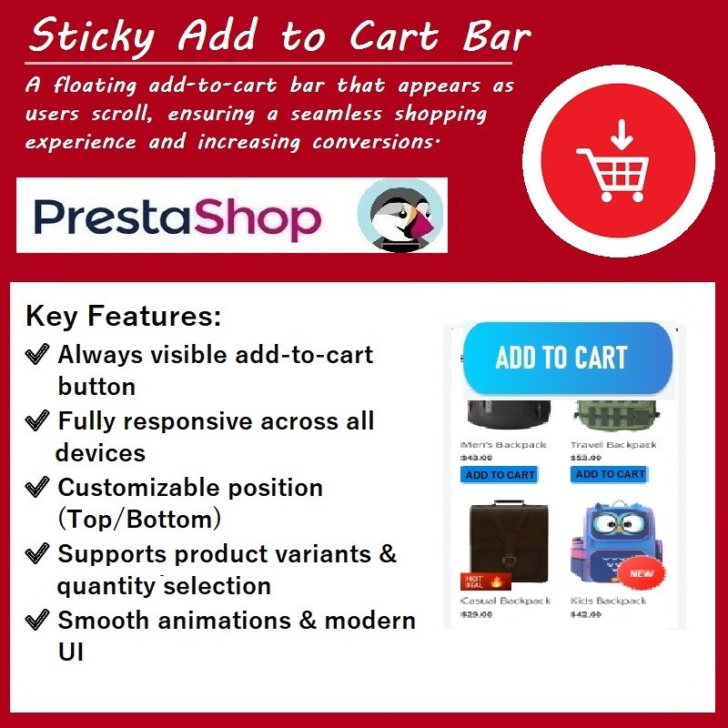 Improve your store's user experience with a floating sticky add to cart bar that follows customers as they scroll. This module keeps the add to cart button visible, making it easy for customers to add products to their cart at any time. It's fully customizable and works seamlessly on all modern devices and themes.
