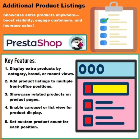 Display multi-featured extra product lists by category, manufacturer, supplier, recently viewed, chosen products, and more. Show product listings in multiple front-office positions to enhance visibility and engagement.