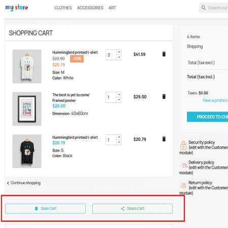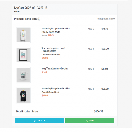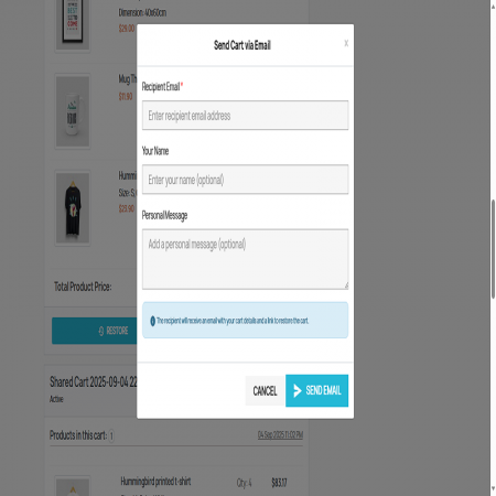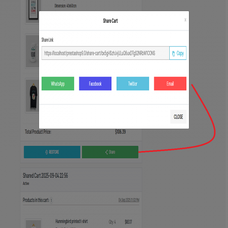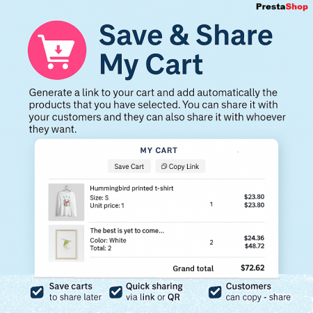 The Save & Share Shopping Cart module is a powerful tool designed to improve your customers' shopping experience and increase conversion rates for merchants. It allows customers to save their cart for later, share it with friends or family, or restore it at any time. Merchants benefit from advanced analytics, discount options, and opportunities to recover abandoned carts. This feature-rich module ensures a smooth shopping journey and increases customer engagement, leading to increased sales and customer satisfaction.