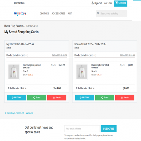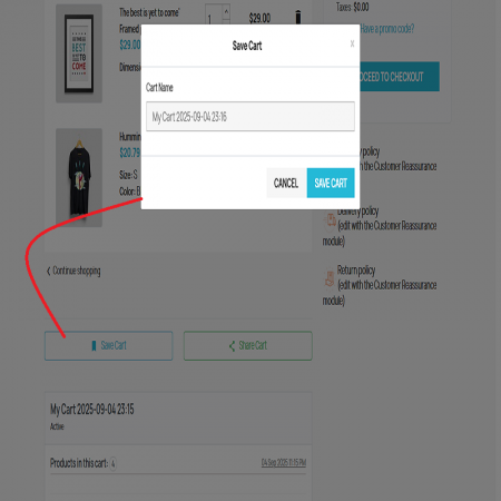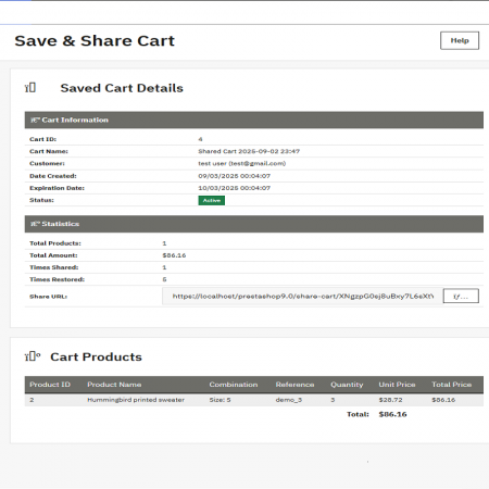 The Save & Share Cart module allows customers to save their shopping carts, share them with others, and restore the cart at any time. Merchants get full control and analytics, making it easy to track customer activity, improve conversions, and enhance user experience.